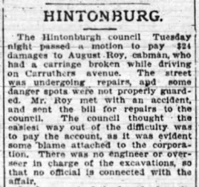 How named: Cave Street was a name used only on paper, no one ever lived on it while it had that name. It was named Cave Street due to Cave Creek which ran through the street, and also because there were caves that opened up along this street. In the late 1880s, the name Hurdman Street was used briefly, as a large portion of the street had been purchased by the well-known lumberers, brothers William and Robert Hurdman. However, in 1893 Hintonburg separated from Nepean Township, and became an independent village. In 1894, several of the streets in the village were renamed to honor members of the first village council that had been stood up in 1893, thus Hurdman Street was renamed "Carruthers Avenue" (other renamed streets in Hintonburg for members of that council include Ladouceur, Gilchrist, O'Meara and Young). Carruthers Avenue at this time ran only from Wellington north to Scott. The Mechanicsville portion was renamed from "Second Street" to Carruthers Avenue in 1912 after Mechanicsville was annexed to the City of Ottawa, and of course Second Street was already a well-used street name in Ottawa. The decision was made to simply use the Carruthers name and create one single-named street from Wellington to the River.